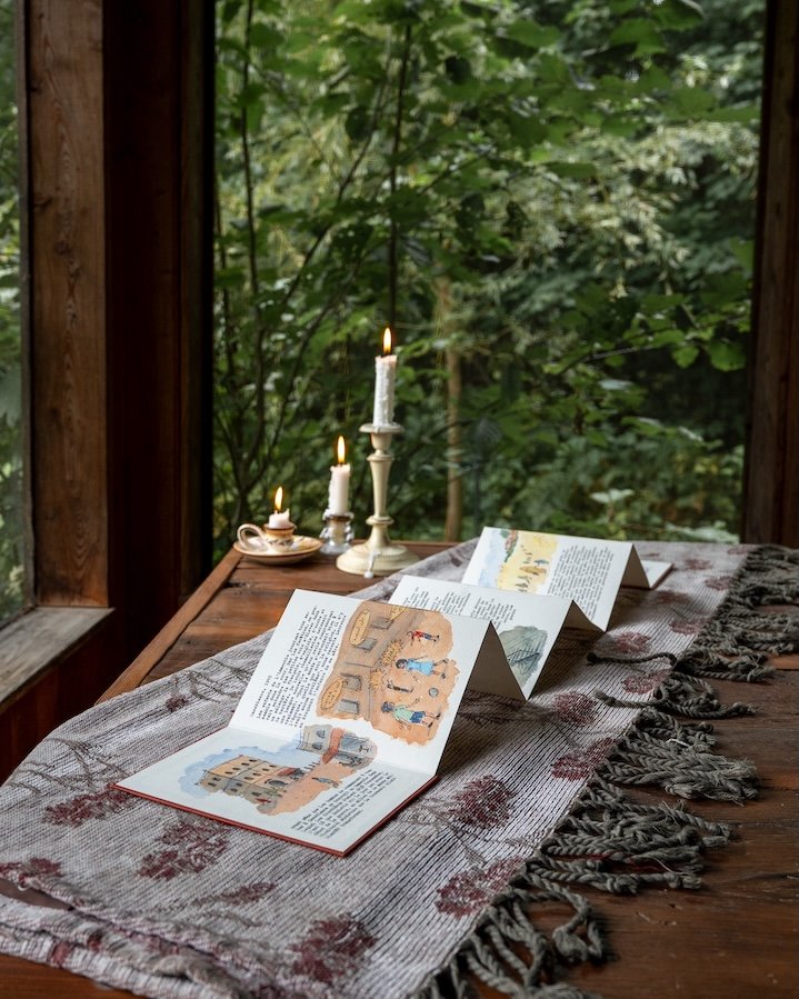 La fresque partagée, c’est une histoire racontée et illustrée sous forme d’un livre-accordéon artisanal. Nous écrivons un récit tapé à la machine et l’accompagnons d’aquarelles originales qui en soulignent les moments forts.